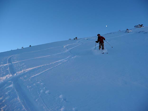 Belle après-midi avec une neige de très bonne qualité. Par contre, dès que la pente est "raide", il faut éviter de trop se lâcher. En faisant gaffe, nous n'avons fait que quelques touchettes superficielles.