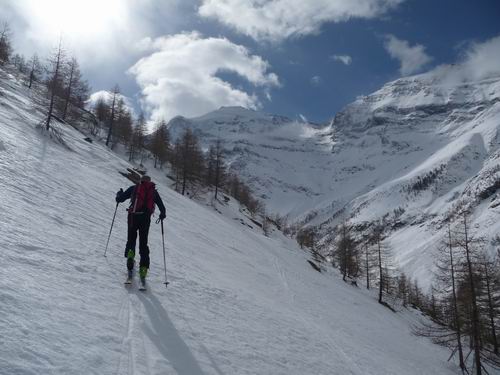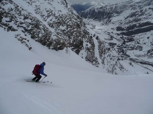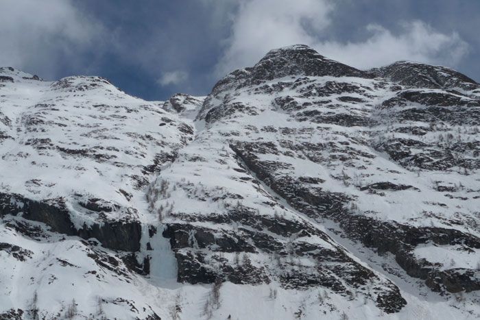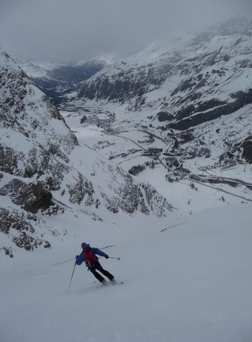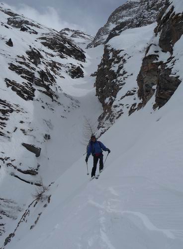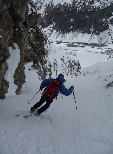 1000m de déniv, 1000m de pente, un bon ratio ?! Belle vue sur Charbonnel en montant (très soufflé !) puis un couloir large et peu raide au départ qui se rétréssie et s'incline d'avantage en plongeant sur Bessans. Ne pas oublier de s'échapper avant la cascade ! 4.3/E4, jamais très raide.