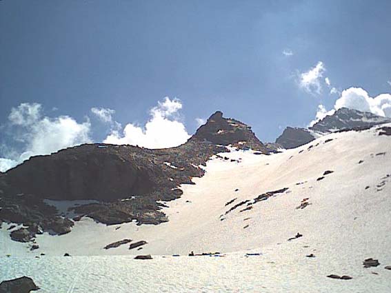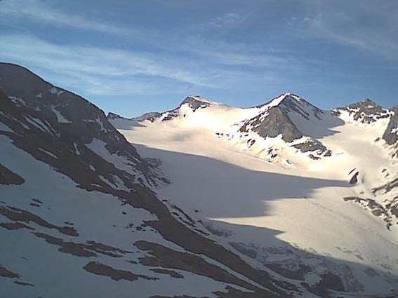 J'ai choisi de porter jusqu'au col et encore un peu après à cause de nombreux passages déneigés, mais attention à la neige molle et aux nombreux trous et cours d'eau dans ce secteur. Sur l'arête, j'ai dû déchausser à nouveau vers 3300 sur 100 m et à 3450, où j'ai laissé les skis, parce que la face finale était vraiment vilaine (neige très molle, rochers un peu partout). J'ai continué à pied jusqu'à 20-30 m sous le sommet et je suis tombé sur une plaque de glace sous la neige pourrie dans la partie la plus raide. Il aurait fallu cramponner, mais comme je commençais à me méfier de gros nuages en train d'arriver au sommet, j'ai choisi d'en rester là. J'ai effectué la descente entre 10 h 30 et 11 h 30, mais je ne crois pas que cela ait beaucoup compté en ce qui concerne la neige. La rive droite du glacier était bonne à skier en godille (c'était pas de la poudre, mais ça se skie un peu pareil). De la croupe à 3300 au replat 2544 (en fait 15 m au-dessus), on skie sans la moindre interruption et je n'ai pas touché un caillou. Finalement, cela fait 800 m de ski, un peu juste pour le fameux ratio 60/40 mais pas loin. Je n'ai vu personne, pas même au refuge, mais trois beaux bouquetins mâles et une femelle qui les observait à distance
