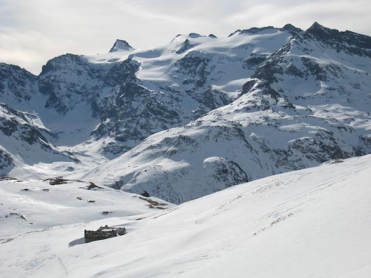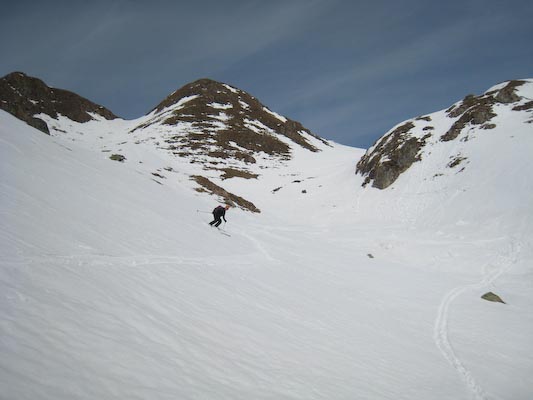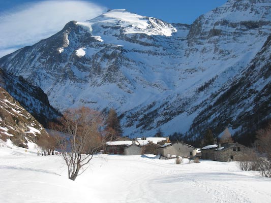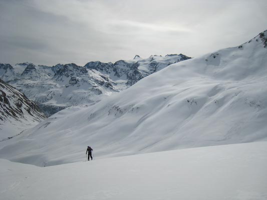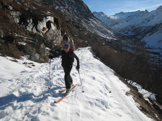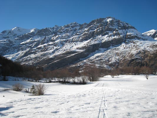 Le début de I4 est déneigé, nous avons donc suivi la route du col de l'Iseran qui l'est. A 1900m la quitter pour monter le long du ruisseau qui mène aux granges des Druges. Une traversée horizontale passe par les granges en coupant des pentes N (possibilité de plaques) amène dans le vallon des Fonds.