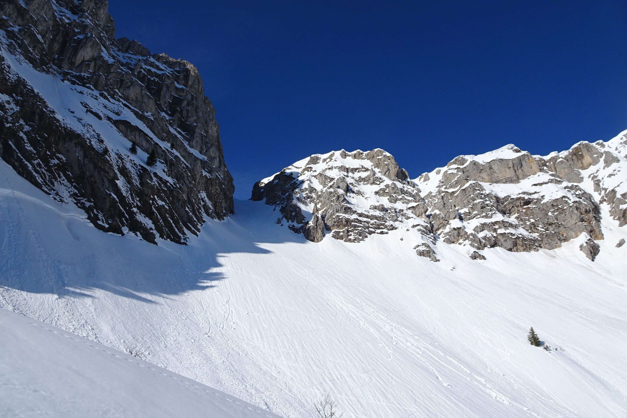 Parking au col des Deux pour suivre le sentier d'été et ne pas passer par le ravin de Farnaud, aux allures de coupe-gorge. Avec l'enneigement actuel le sentier passe bien même si il n'est très skiant. Ensuite l'itinéraire rejoint le descriptif du topo. Dans la petite prairie avant l'arête j'ai encore suivi le tracé du sentier, plus à droite en montant.