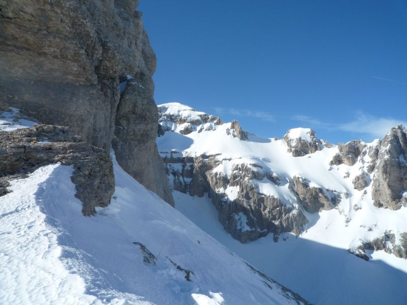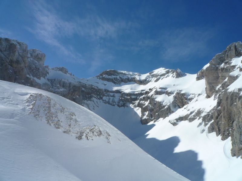 C 'est un peu la misère par ici .Les conditions souffrent de la comparaison par rapport à la Savoie.Des faces entières sont décapées par le fort vent de ces derniers jours.Des accumulations un peu partout parsèment le Vallon du Grand Villard.