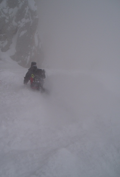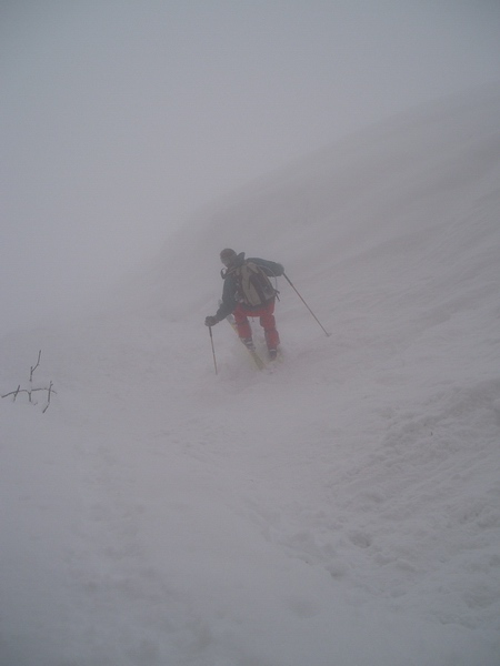 Montée par A2, départ du couloir pas évident à trouver dans les nuages (traces de dimanche d?Olivier et Nicolas plus visible) mais Thierry connaît le coin comme sa poche. A la descente du couloir après l?étroiture sommitale nous avons traversé un dizaine de mètres à droite, ça évite la deuxième étroiture et c?est beaucoup plus skiant.