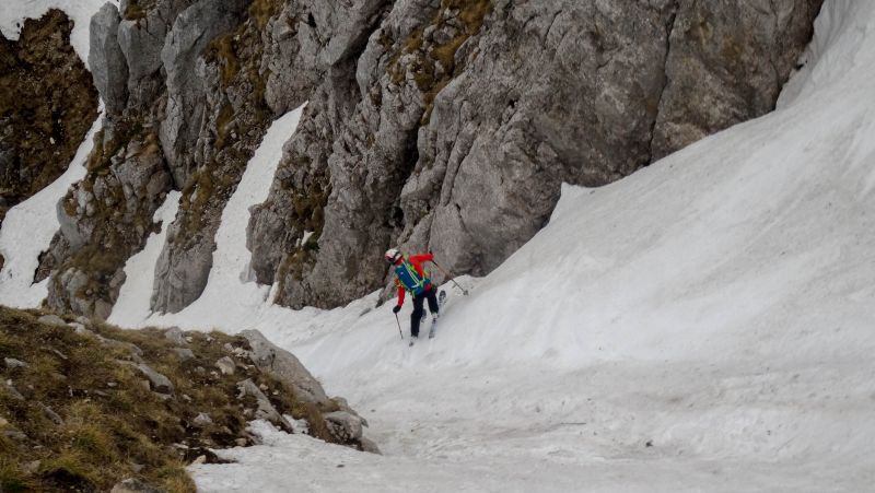 Certains dans l'équipe étaient dubitatifs... Et c'est vrai qu'elle est étonnante cette neige de névé, quasi insensible à l'isotherme élevé et au vent chaud elle permet un ski agréable, d'autant plus que la pente est soutenue.