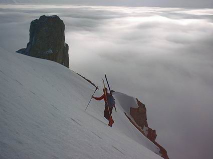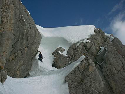 Montee par K6-1 dont nous avons trouve l'acces à la faveur d'une eclaircie. Stop sous l'impressionnante corniche sommitale et descente par le couloir en excellente condition. Seuls les 50 premiers metres etaient en neige dure mais avec du grip