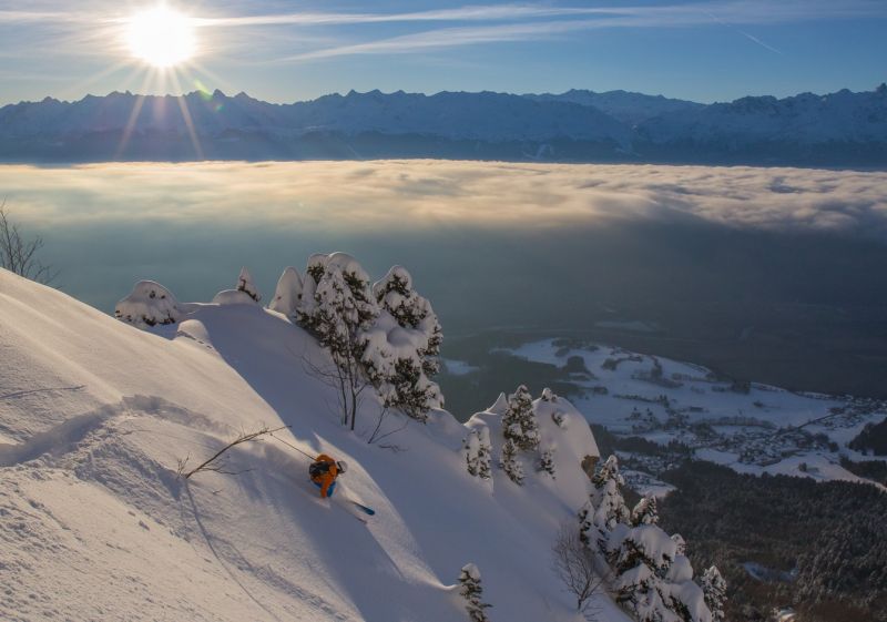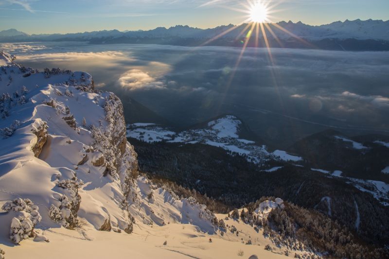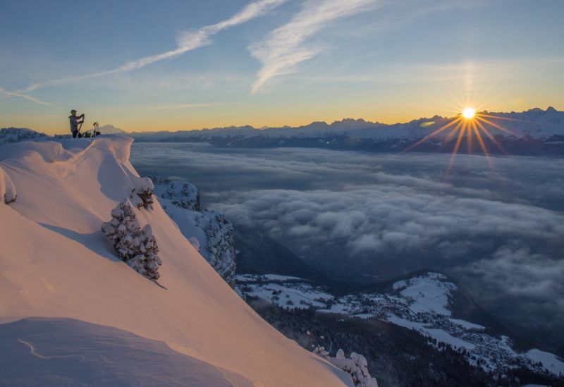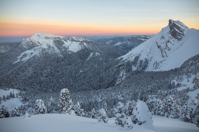 Lever de soleil toujours aussi féérique avec ces conditions. Neige parfaite mais la forêt reste quand même assez dense et demanderait un peu plus de remplissage pour tasser les arbustes. Merci à Régis pour la trace.