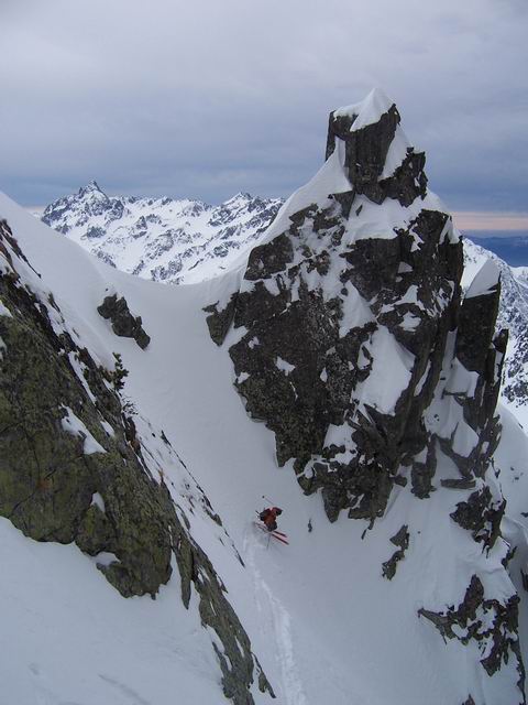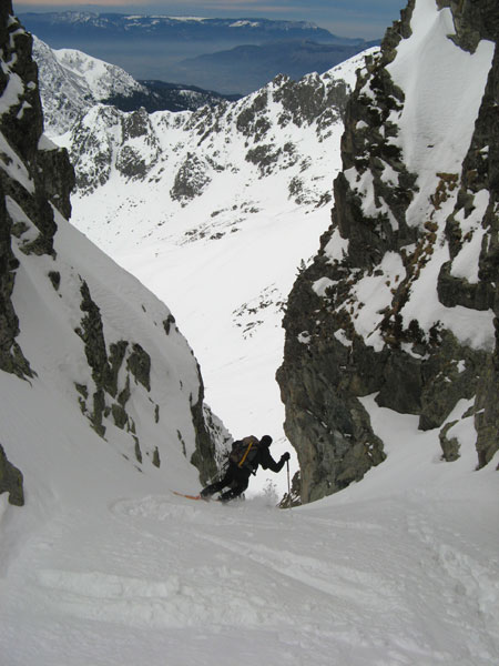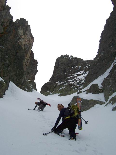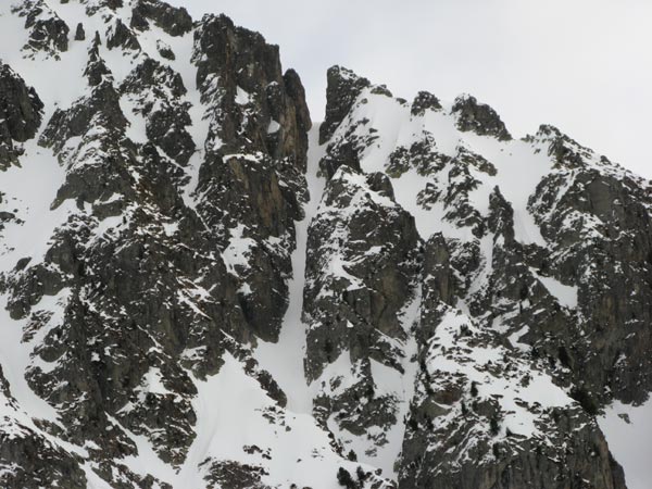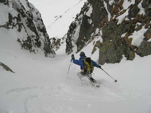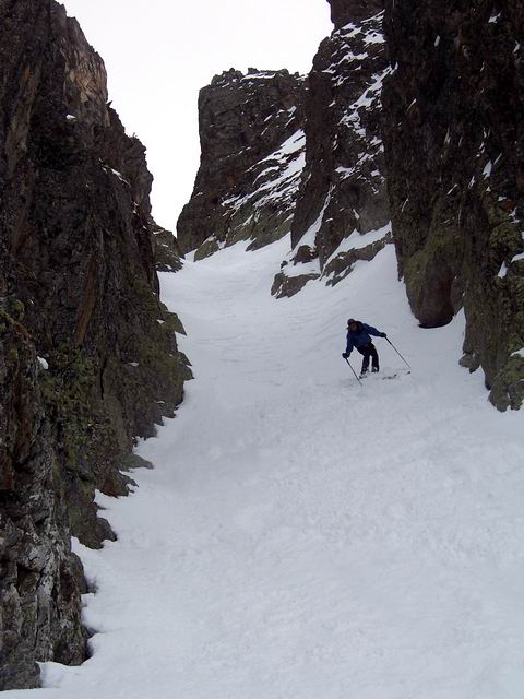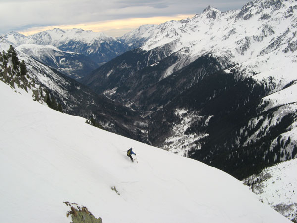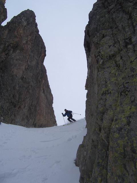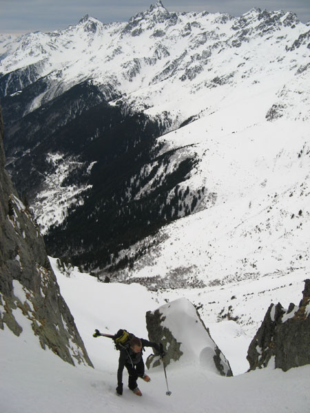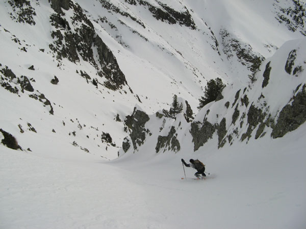 Pas envis de faire trop de voiture avec les chassés croisés, on part de Parbert en visant la transfo. La couverture nuageuse nous fait changer d'avis après avoir traversé le Pas du Pin (poudre en rive D, dure avec bon grip en rive G). On vise la poudreuse dans le couloir très encaissé de la Crête de Cheval bien visible du Pas du Pin. L'ambiance y est superbe même si on va le chercher un peu loin pour ses 250m, mais il en vaut la peine... cot 4.3/E3 car coudé en bas. Déniv 1850m. Y'a encore à découvrir à 2 pas de la maison ...