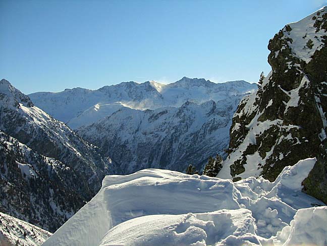 Gros transport principalement sur les orientations Sud, ça a du souffler un peu dans tous les sens avant : par exemple corniche de 2m côté Est du Pas du Pin. Les crêtes et arêtes exposées au vent se dégarnissent, les faces et couloir se vitrifient... mais on a pu constater le matin un transport vers l'Est