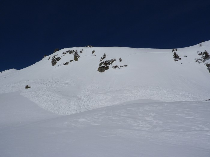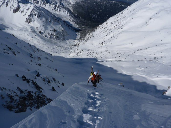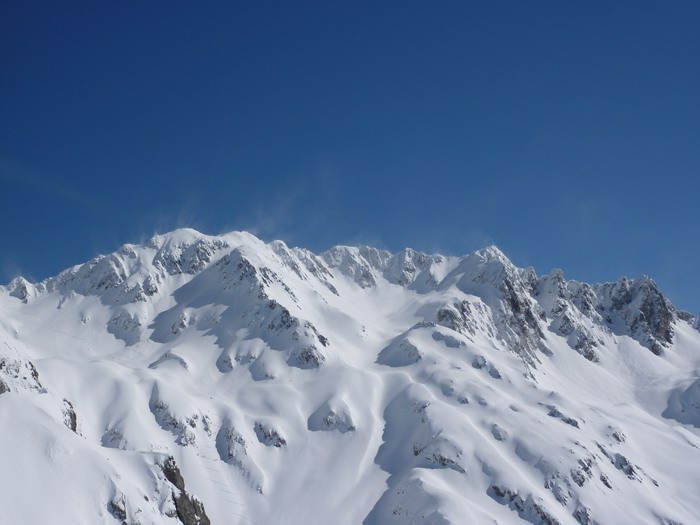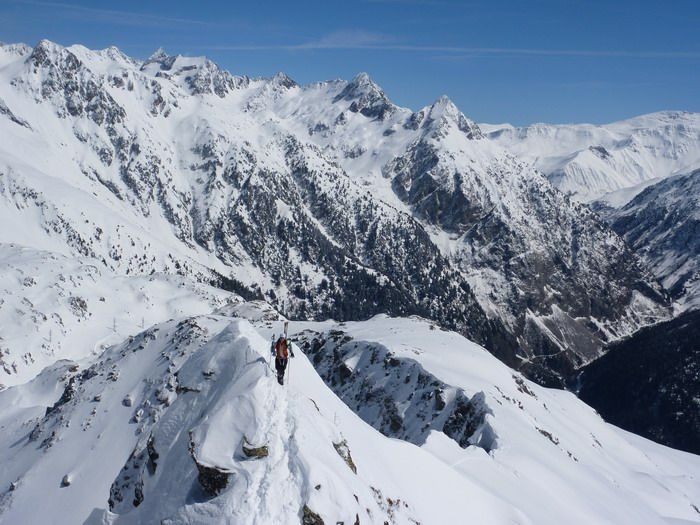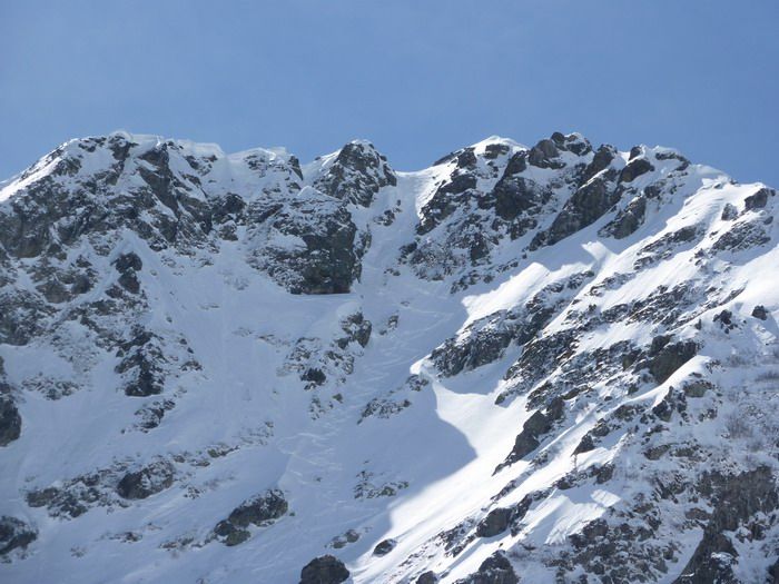 Grosse accumulations dans le couloir ouest du Pin, difficile à remonter du coup on prend l'arête rive droite (très joli). 5 à 15cm en versant est à sud, départ de petites plaques en versant sud-est le long des crêtes et coulées de purge superficielles en versant sud. Peu de neige sur un fond ferme de vieille neige en haut du versant nord du Sifflet.