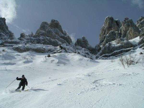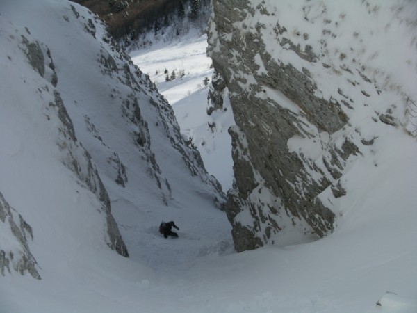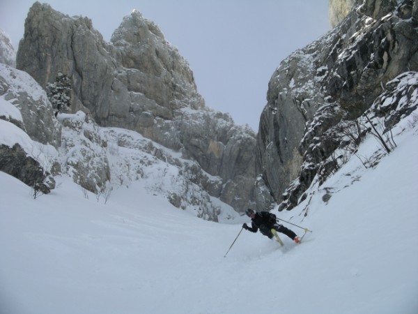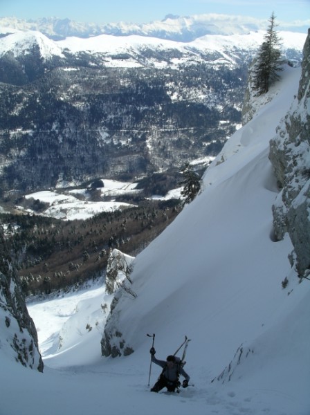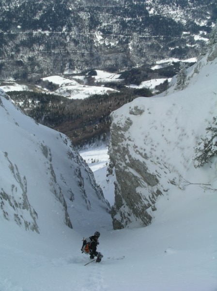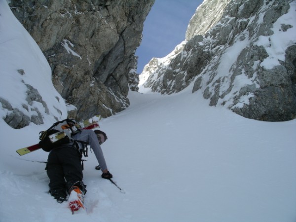 Neige en cours d'humidification, mais on sent le fond dur quelquefois. pas de trace de neige ventée, couloir bien rempli.