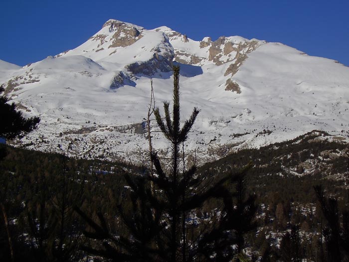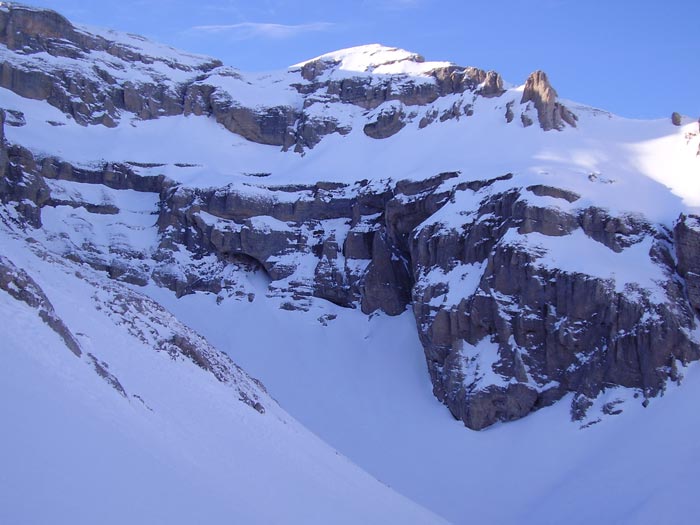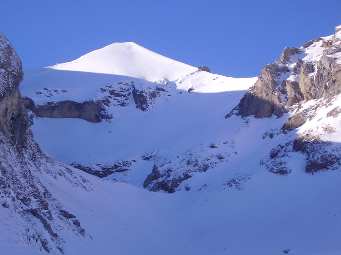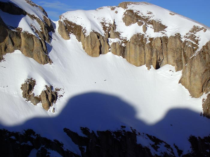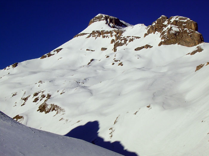 François avait promis, sur la foi de ce qu'il avait pu constater une semaine plus tôt en faisant ce pas en aller-retour par le nord, un vallon du Grand Villard en grosse poudre... et sa compagne Patricia, qui se remet d'une opération des croisés, comptait bien là-dessus tout le long de cette ascension quand même assez longue, surtout en partant du Grand Villard. Je ne vous dis pas sa déception quand elle a dû affronter une neige croûtée piégeuse, parfois gelée, embarquant le ski... Heureusement que le bas, à partir de 2000 environ, était encore en bonne poudre. Malheureusement, la suite, mélange de poudres plus ou moins humides avec cailloux embusqués, n'était que le prélude d'une piste redurcie par l'heure tardive et parfois verglacée ! Croisé au pas trois skieurs montés par le nord. J'ai plusieurs fois cherché à semer l'ami Guy (bientôt 70 printemps), mais je n'y suis pas parvenu !