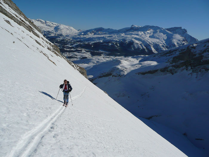 N'ayant pas trouvé où se garer au Grand Villard, nous avons laissé les bagnoles au virage des Pertusets et porté sur 500 m jusqu'au village et chaussé sur le GR 93, que nous avons suivi jusque dans le creux du vallon de Charnier vers 1800. Là, remontée très agréable des pentes sud-est jusqu'au pas la Cloche, descente du versant nord par le vallon du Grand Villard. Vers 1750, nous avons tiré à gauche pour contourner la barre des Fontaines et descendre au mieux sur la cabane pastorale à 1515 m (couchage possible). De là, nous avons suivi la piste, peu skiante, jusqu'au Grand Villard. Au prix d'une manœuvre de bagnoles, on peut partir de Maubourg et arriver au virage des Pertusets. La rando de ce jour est l'inverse de celle qui est indiquée dans l'" Isère " d'Hervé Galley et Emmanuel Cabau, ouvrage dans lequel j'ai pioché cette très jolie rando, pour laquelle je les remercie.