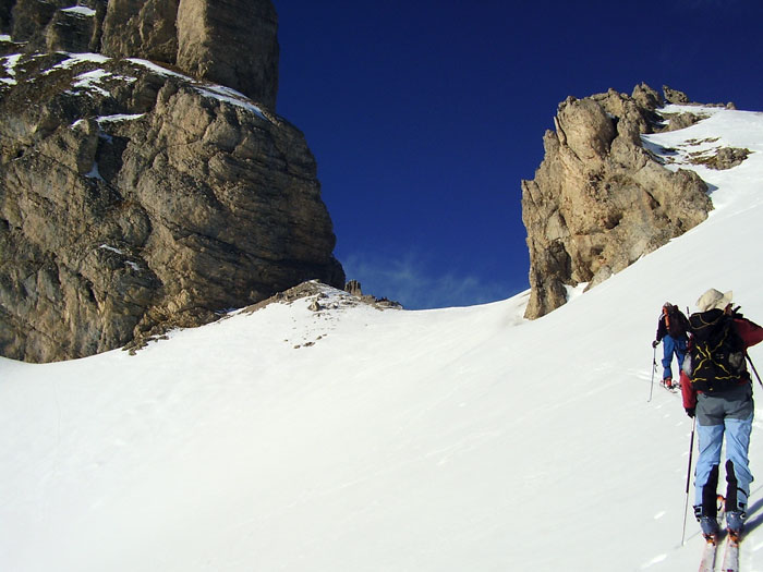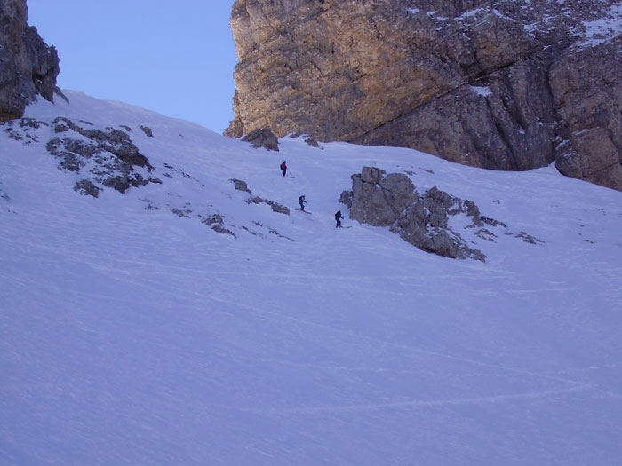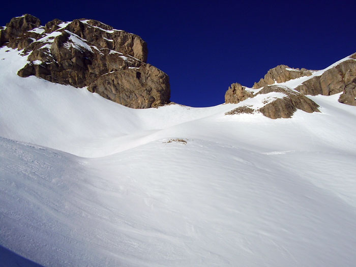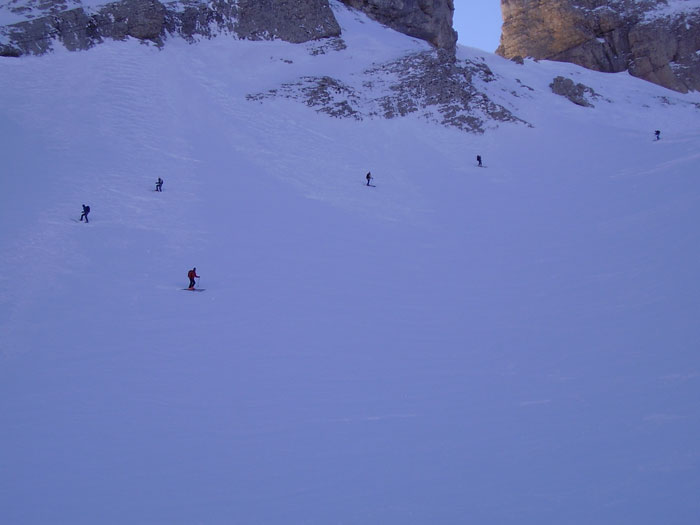 La pente sud-est de montée au pas est bien stable. Le versant nord a été plaqué mais il est stable maintenant, par la descente directe sous le pas ou en tirant à gauche pour éviter la partie la plus raide. Du pas, nous avons vu en face des chamois qui traversaient les pentes très raides et suspendues de Pra Purc, et tout s'est bien passé pour eux...