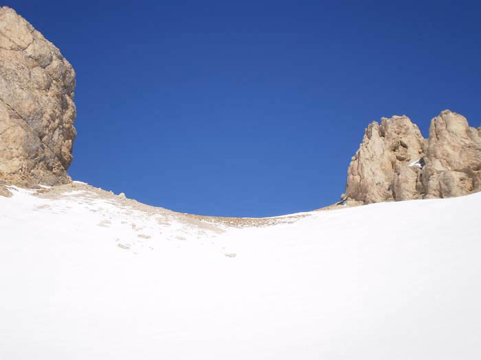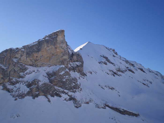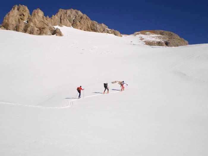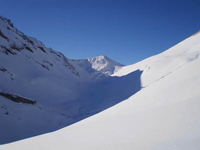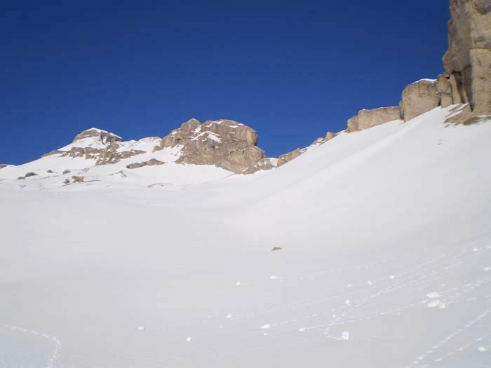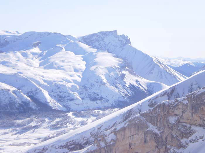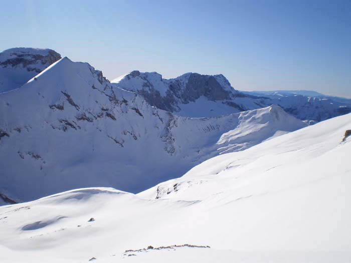 Nous étions partis pour Soleil Bœuf, mais il a bien fallu faire autre chose, car les pentes du haut étaient quasi à sec sur plus de 200 m ! Au départ, nous étions tous gelés, mais dès que nous avons dépassé les bancs de brume, nous avons récupéré un degré toutes les minutes. Montée bien chaude et magnifique. Le pas la Cloche est toujours aussi splendide, typique du Dévoluy. Du pas, nous avons pu apercevoir une belle trace de descente qui partait de dessous l'arête nord-est du petit Ferrand. Faudra qu'on y aille un de ces jours... À la descente du pas, nous avons dû franchir un étroit goulet en escaliers (dans la pente la plus directe, car le départ normal en traversée à gauche est plein de rochers) et j'ai touché un ou deux méchants cailloux.