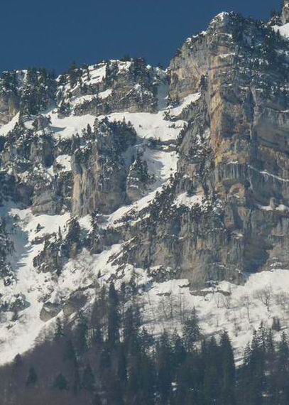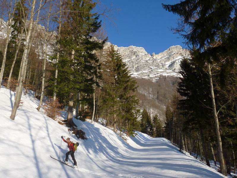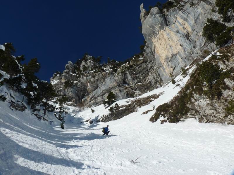 Du Villard, itinéraire plutôt direct jusqu'au pied de la face. Un crochet droite-gauche amène sous le passage mais un ultime ressaut 50m sous la sortie semble difficile à combler. Pendant que j'attendais dessous, Manu est monté, a chaussé et eu bien du mal à redescendre jusqu'à moi skis aux pieds ! L'itinéraire n'est jamais très raide, mais les traversées sont bien exposées Le départ du Villard est d'une logique implacable quand l'enneigement le permet, tant la forêt est belle à skier
