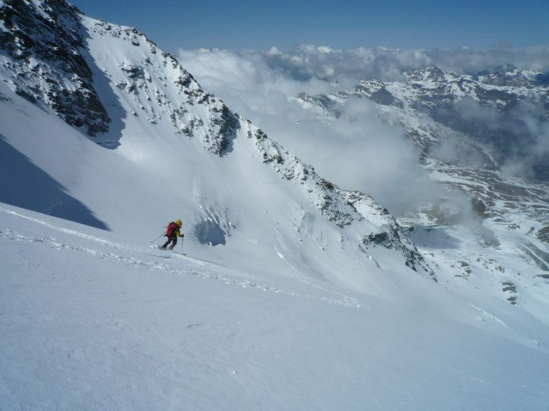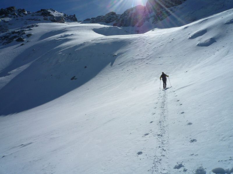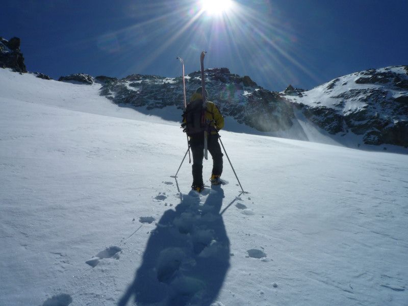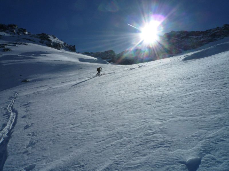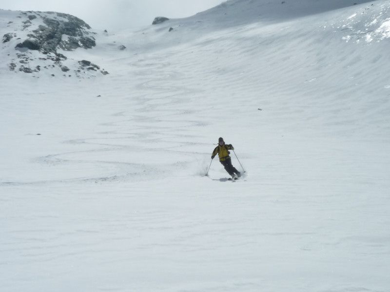 Légère poudre (5cm)sur fond dur,puis à 50 m du sommet accumulation de neige roulée sans cohésion qui nous dissuade de terminer(j'enfonce tout le bâton)