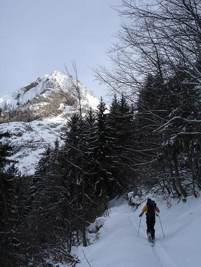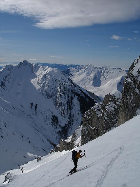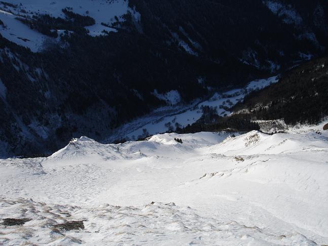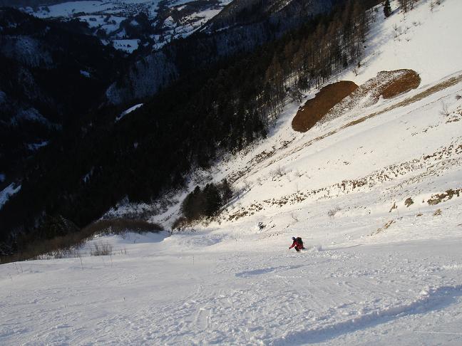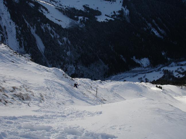 Les conditions sont bonnes pour l'Armenaz, bientôt bonnes en sud (transfo), mais n'étaient pas optimales pour cette face. La poudre compacte posée sur le fond herbeux et les ressauts mal comblés nous ont obligé à déraper une partie du haut de la face et louvoyer pour trouver les bons passages. La partie inférieure est bien meilleure, les quantités et qualité de neige étant un peu supérieures.
