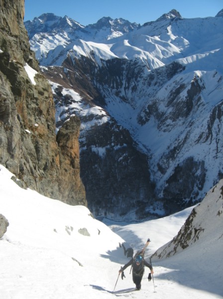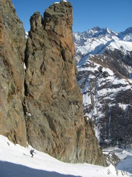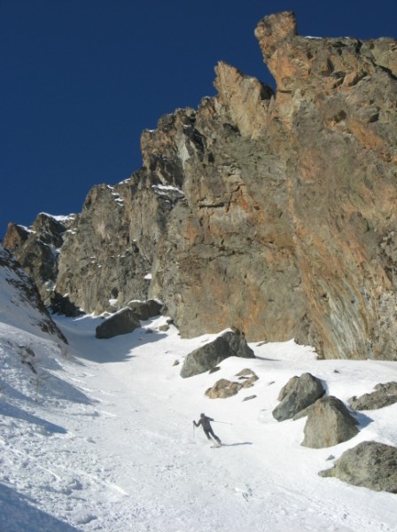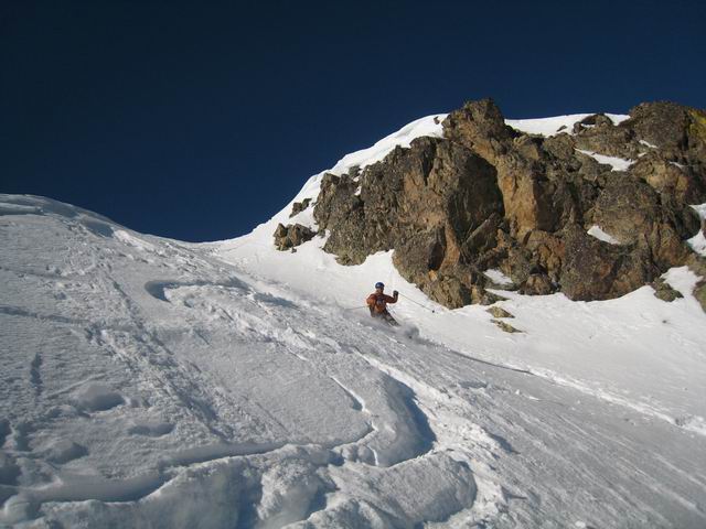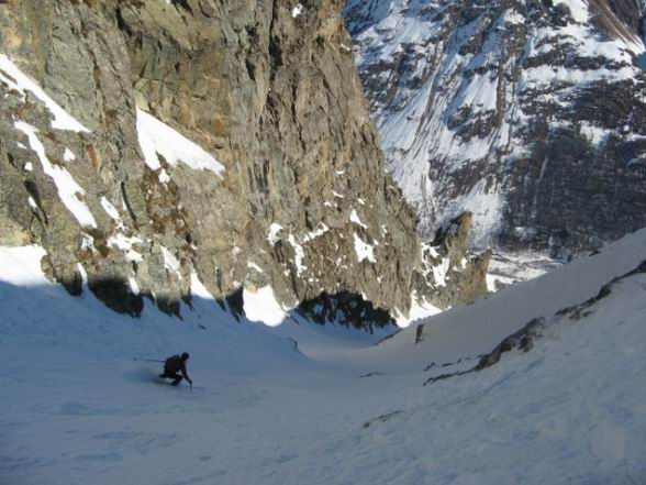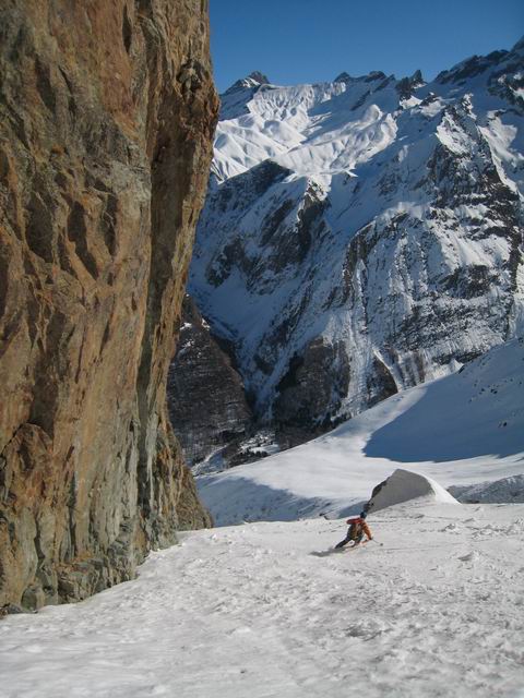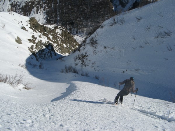 Dans le Couloir, de tout entre très bon à excellent : poudreuse dense en rive droite, en cours de transfo en rive gauche, en passant par des zones de grain fin ; sans une seule zone de croûte, autant dire que ce fût fantasmagorique !!!