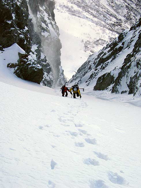 Montée par le vallon de l'Espalier puis vers 1900m, tirer à gauche vers le couloir-rampe dérobé (bien repérer le cône d'accès depuis La Morte) qui sort au pt. 2568. Petit Armet accessible par l'arête ensuite. Le couloir est ouest mais bien protégé au sud donc se comporte à cette époque comme un couloir nord (sauf les 50 derniers mètres qui voient le soleil). On mesure sur la carte environ 45° sur 600m mais on emprunte des contre-pente souvent plus raide. Un bon 5.3/E3 (à confirmer - ça nous a pas semblé si loin de l'Infernet).
