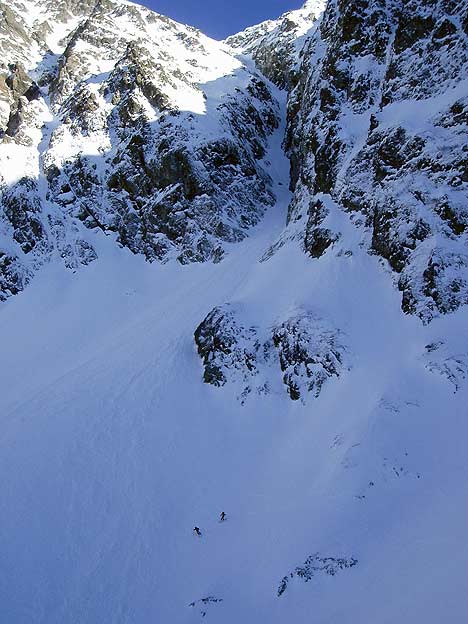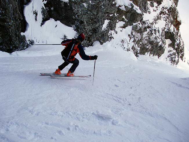 Repéré le dimanche précédent depuis le Grand Serre, ce couloir est extraordinaire. Encaissé et bien raide. Exposé car tournant avec un rocher au milieu dans le bas. A-t-il déjà été descendu ? La partie supérieure est en bonnes conditions, le tiers inférieur en neige dure avec une goulotte qui nécessite à la montée, un repérage des bons points de passage pour la traverser à la descente. De haut en bas en tout cas, la neige ne pardonnerait aucune faute.