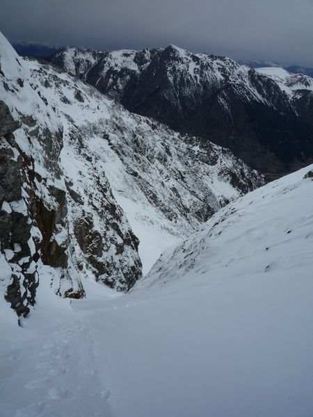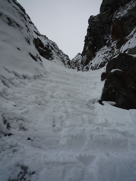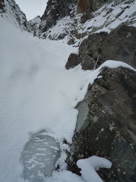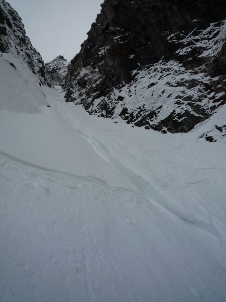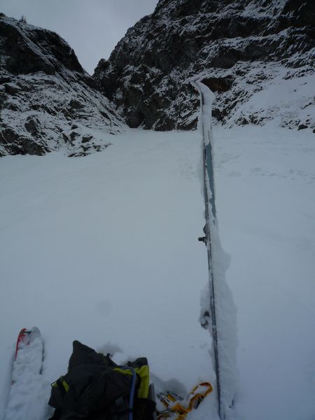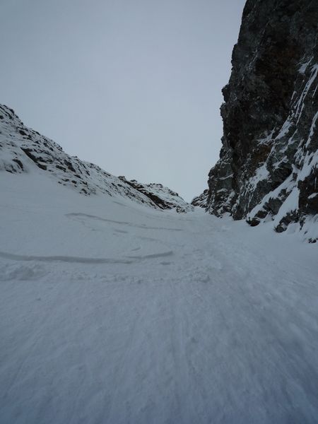 Le couloir est bien goulotté sur la moitié inférieure. Goulotte en neige dure et glacée mais les contrepentes sont bien agréables à skier, 10cm de neige fraiche humide sur croûte portante à ski avec bon grip. Tout passé à ski et le piolet et resté sur le sac, malgré l'étroiture en glace (le relais est bien découvert sur le bloc)