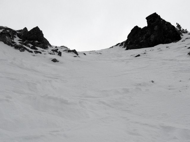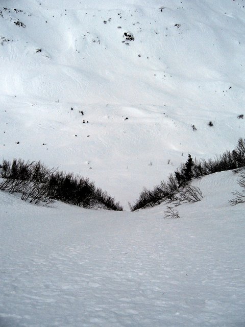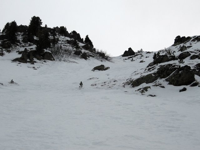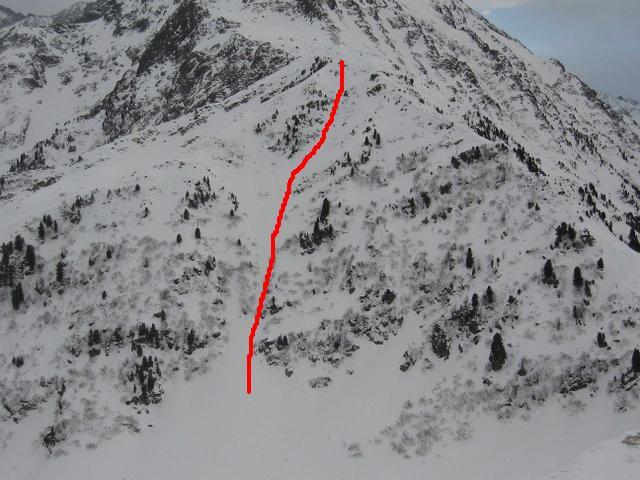 Je l'avoue, j'ai profité du télésiège des Plagnes pour gagner un peu de temps. Pour le reste, ce couloir mériterai d'être répertorié en variante. Jusqu'au cone de déjection, près de 250m plus bas, ça débande pas vraiment. On est dans du 40° avec qlqs passages bien plus raides, parsemés de rocaille affleurante. Un peu tendu au départ de se lancer la dedans, à vue, cela s'est révélé être excellent, pas de pièges (bien visibles sinon) et en bas, ça passe dans la petite goulotte dans les vernes moyennant un petit (petit!) saut.