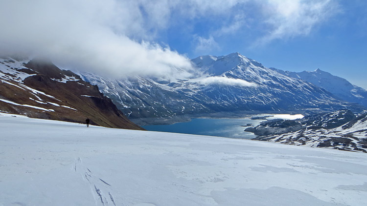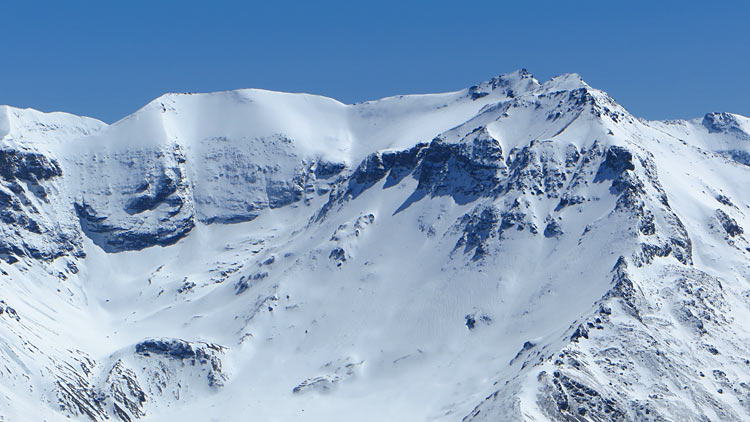Le vent du départ laisse place à une fournaise dans la montée du couloir Sud, on débouche sur la crête et là plus rien.
