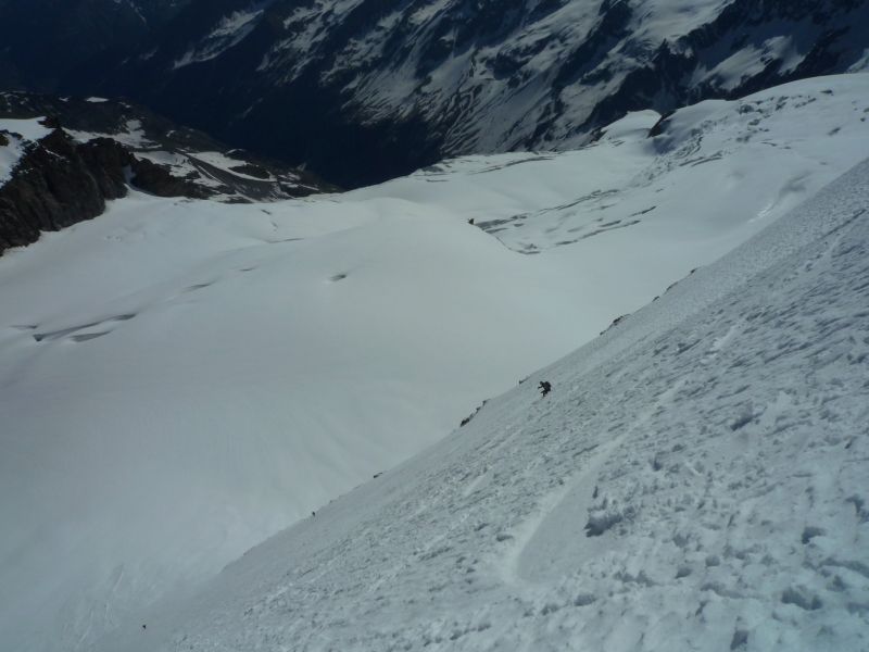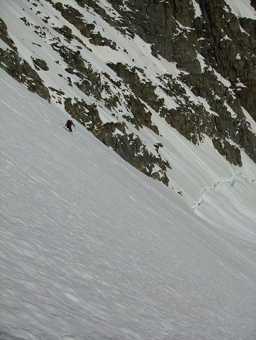 Dans la face ouest du col de Montandayné, la glace affleure par endroits (un relais sur broches est même visible au milieu de la face). La fermeté de la neige nous a sûrement évité quelques frayeurs.