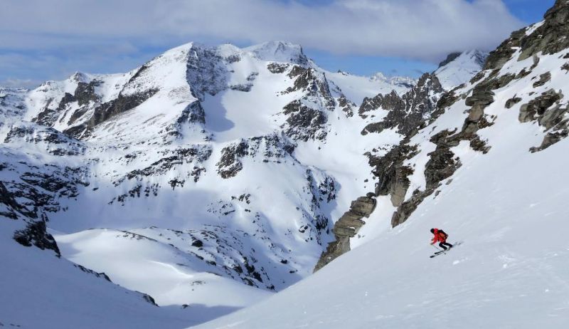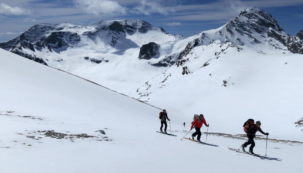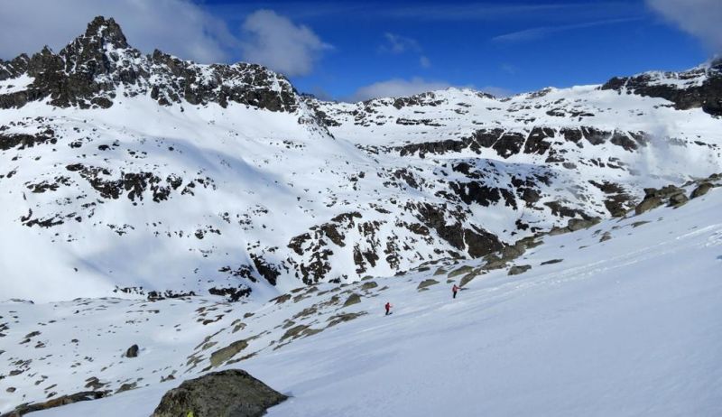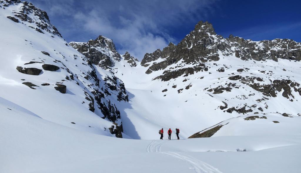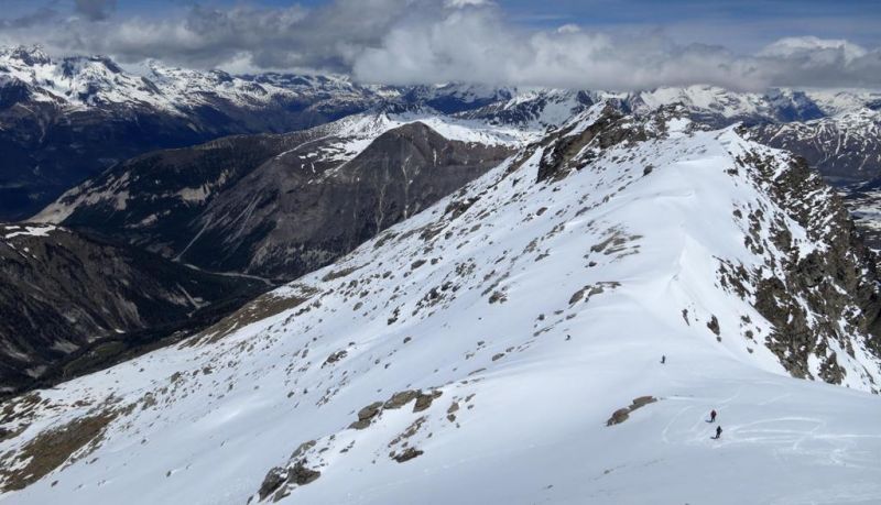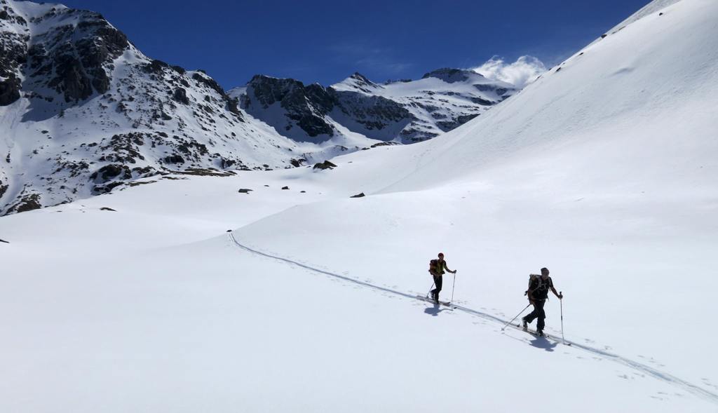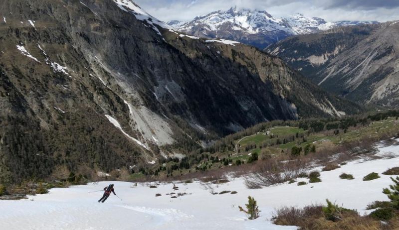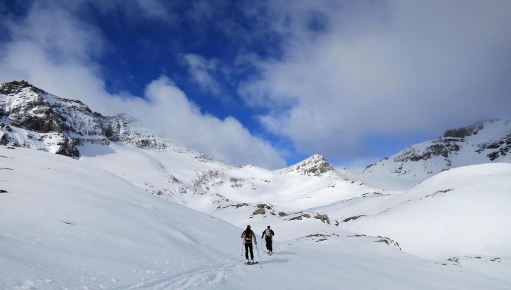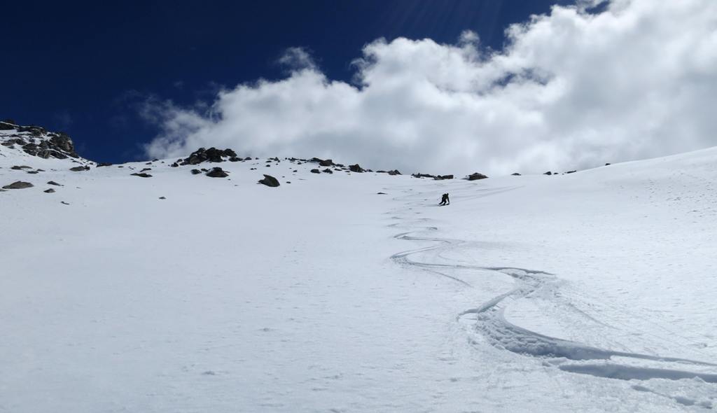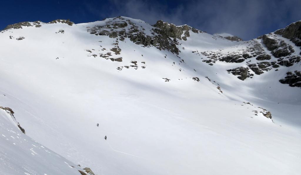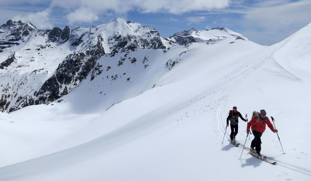 Avec le vent de la nuit les nuages du début de matinée et la piètre qualité de la 1ère descente, les ambitions sont à la baisse. le début de remontée se fait dans une neige pourrie, puis plus haut tout s'arrange et la traversée du petit Vallon s'averera très esthétique, et nous ramenant skis au pieds à 5' de la piste. Conclusion de 2 journées où l'on a n'a pas fait exactement ce qui était prévu, mais on a vu du pays