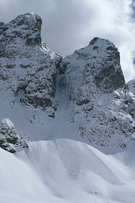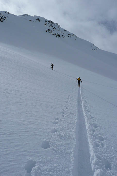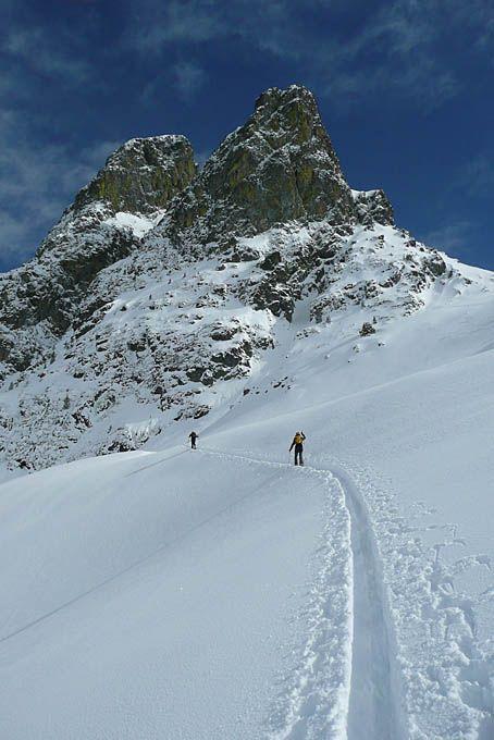 Des conditions humides avec de la neige qui ne sera pas être très skiante dès qu'elle regèlera jusqu'à 2300 m en versant sud et 1800 m en versant nord. Nombreux départs de plaques à la base de couloirs ou de faces rocheuses. La neige fraîche est très dense et l'ensemble ne paraît pas très sain. Nous nous en sommes tenus aux pentes <30° ou alors sur de courts passages.