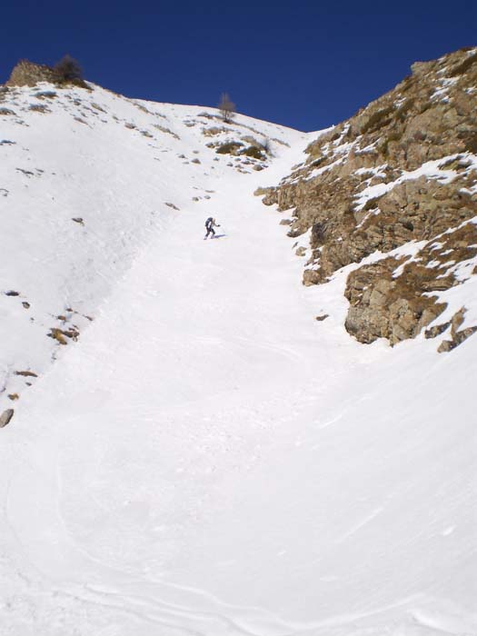 Le grand panard, c'est la neige givrée du bas, dès qu'on est sorti de la forêt. Avant cela, la descente sud était extra, après avoir skié les 100 m sommitaux prudemment. Seulement, comme la neige n'est pas suffisamment tassée, on passe à travers et on touche quelques cailloux fourbes. Descente du col de Combeau sur croûte dure puis dans simili-poudreuse (grains fins) parfois un peu liée, puis sous 2200 dans une poudreuse de grande classe. Descente bonne tout le temps, grains fins légèrement humides dans la forêt et le meilleur en bas, comme déjà dit. Pas pu voir le départ du couloir nord de la grande Autane, mais sans doute trop dangereux encore. Ce tour de Combeau amélioré est une splendeur.