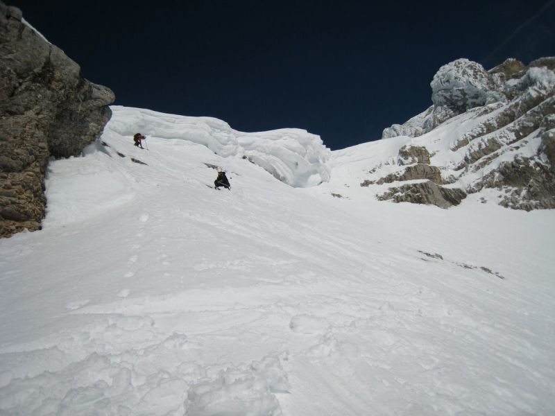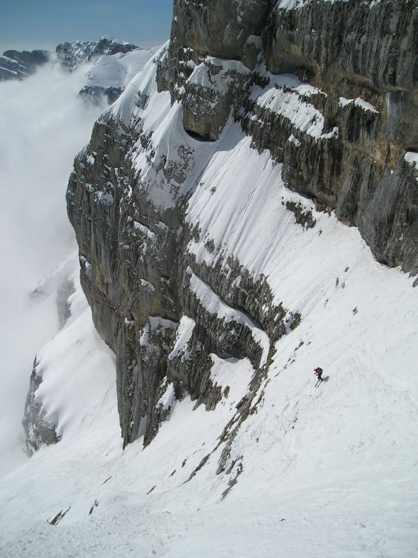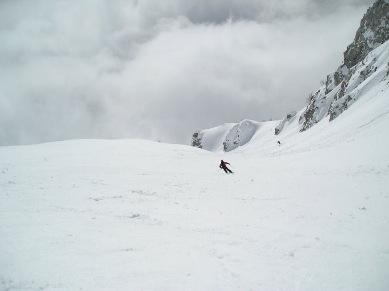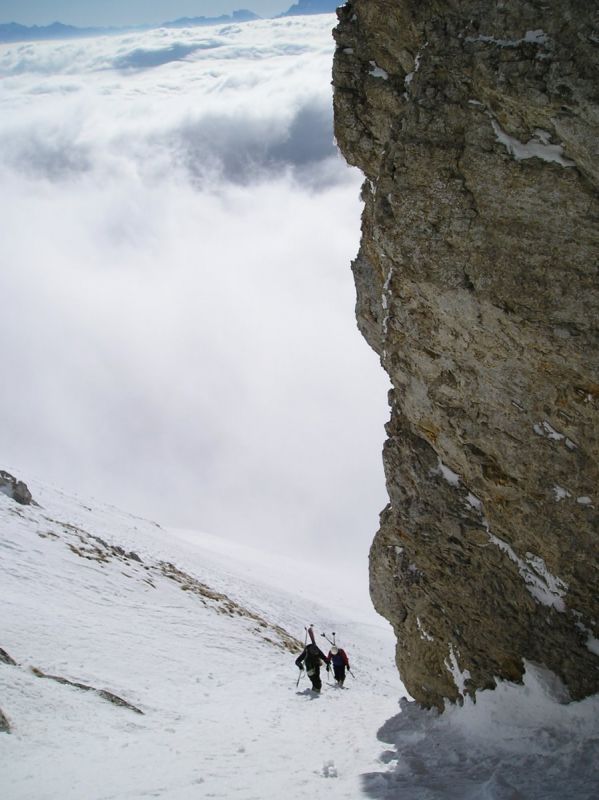 Rien ne bouge hormis 1 ou 2 coulées de neige lourde dans la descente de la Grande Moucherolle en raison de l'heure un peu tardive (vers 13h). Après une matinée dans le brouillard ça a chauffé fort. C'est pas encore de la bonne transfo et on est loin sans doute des conditions rencontrées par Niw 2 jours plus tôt.