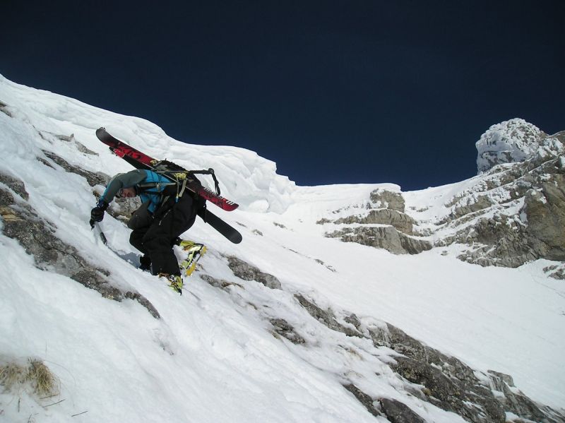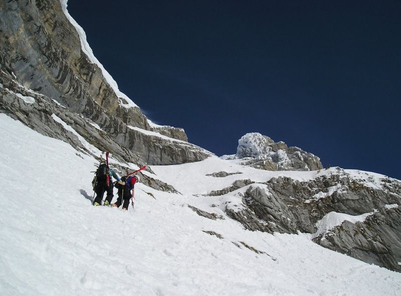 K4.1 en AR puis K4. Dans la face sud de la Grande, 2 passages "dry". L'itinéraire est maintenant bien ravagé. Dommage que le brouillard collant comme un pot de confiture nous ait gâché pas mal la vue. Sinon quelle belle ambiance neigo-rocheuse. Vu du pied de la Petite, c'est vraiment beau à regarder.
