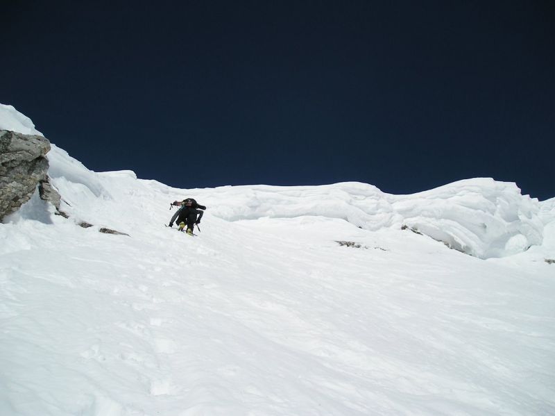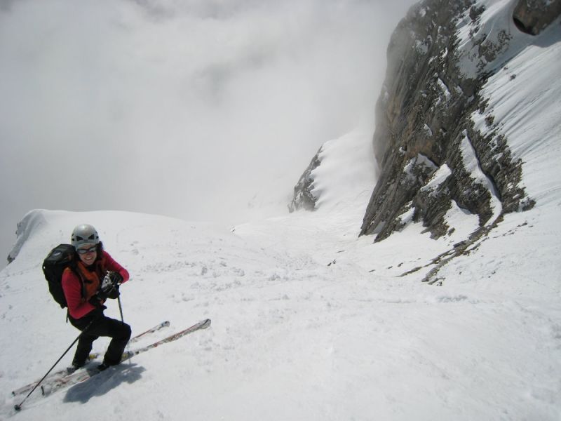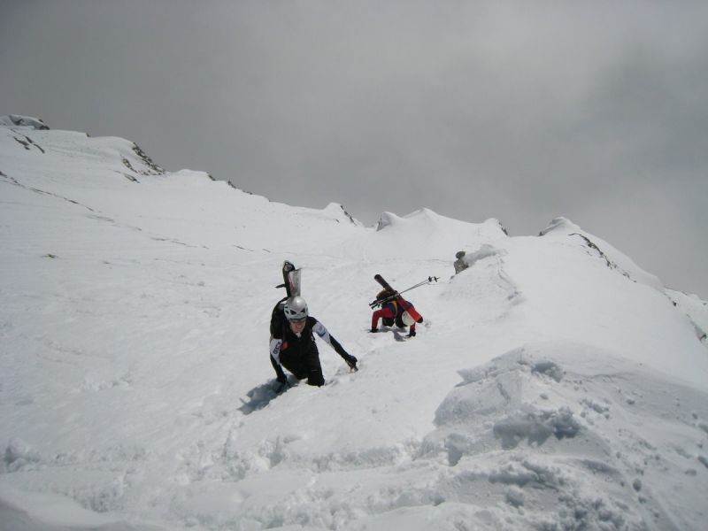 Dès le départ le ton est donné, le brouillard va nous accompagner jusque vers 200m sous le col de K4.1. En haut et même dans la montée c'est le vent de nord qui nous cueille. Une fois sortis du petit couloir, on file se mettre à l'abri dans le refuge à l'arrivée du TSG. Au bout d'une heure on se décide à repartir. Bonne descente de K4.1 puis Loisyann qui y croit encore propose d'aller vers la Grande. Bien mal lui en a pris. Malgré une 1/2 h de retard pour la descente - ça s'est transformé en four - c'était encore correct à descendre. Croisés 2 skieurs qui sont descendus à vue après être montés par la petite