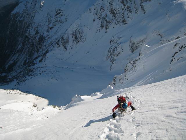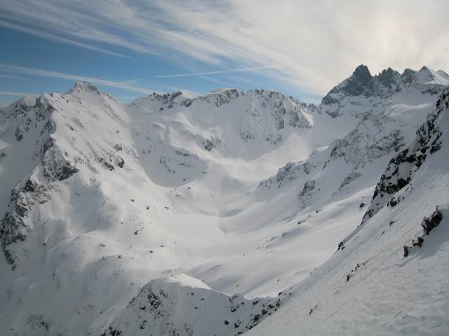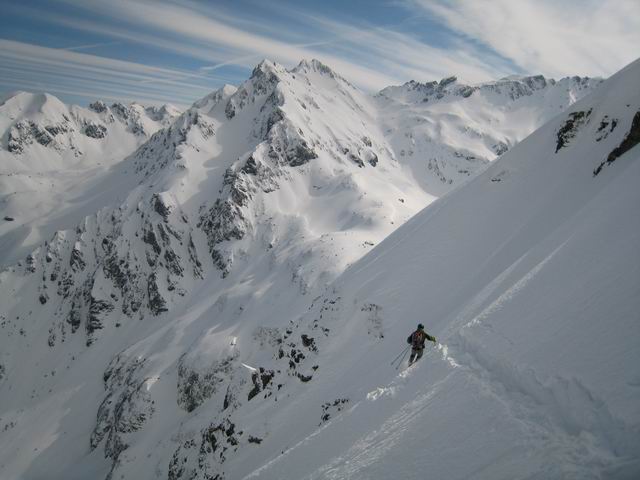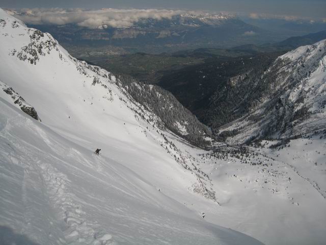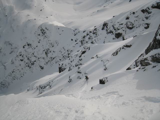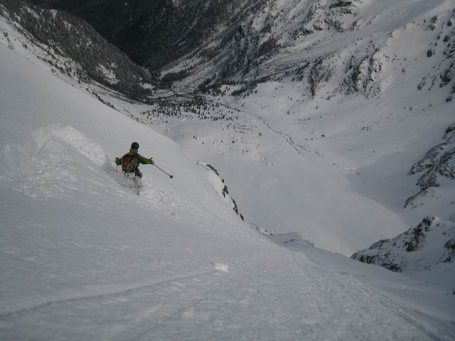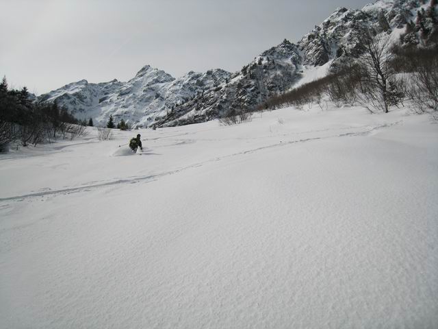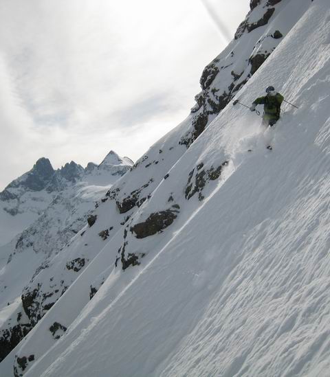 Conditions de neige quasi optimum pour une telle face avec grosse poudre très stable à tous les étages. On retrouve la croûte de pluie sous cette fraiche, notament dans tous les ressauts étroits et croupes exposées, mais cette croûte est finalement bien grippante.