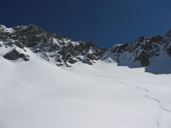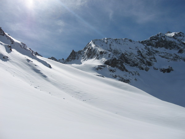 A2 mais après le ressaut et les doutes nivo, la traversée vers le col de menoux ne m'inspirant pas je suis monté droit dans le vallon qui permet de rejoindre le pied du Pey de St Maurice. Pas de sortie facile excepté une couenne de 30m qui permet de sortir sur l'arete (non fait pour cause nivo douteuse)