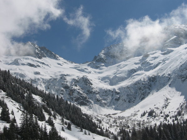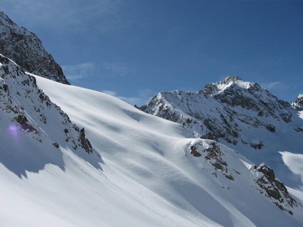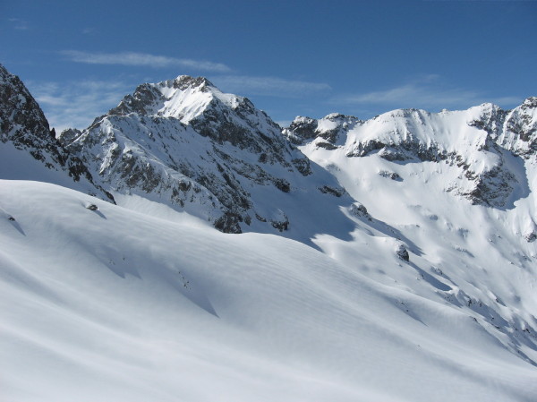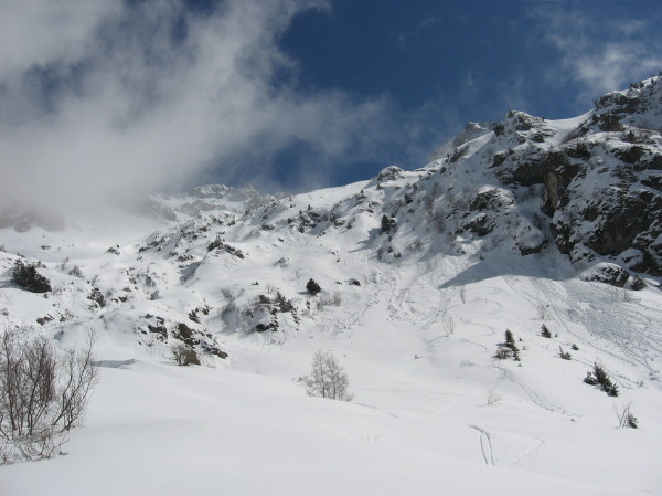 Enfin une vraie chute de neige en haute montagne: les sommets sont platrés et commencent à avoir une bonne mine. Revers de la médaille, au moindre rayon de soleil ca purge: dans tous les versants ensoleillés raides, nombreuses purges toute la journée (T° + douces qu'annoncées) avec formation de boules. En dessous du ressaut vers 1900 c'est crouté cassant le matin, transformé en poudre humide collante pour la descente (+ skiable que la croute...) qui part en boules et en escargots dans les virages. Au dessus c'est bien bon dans le versant W avec le fond dur rassurant pas loin. Néanmoins dans des orientations + froides j'ai pu enfoncer le baton sur 80cm: moins rassurant. A noter également quelques plaques friables sur fond de neige roulée sur sous couche dure au niveau du ressaut qui m'ont obligé à monter à pied dans des zones avec seulement 10 de poudre sur fond dur.
