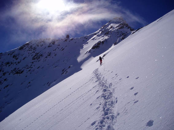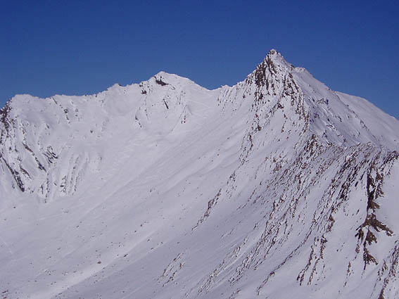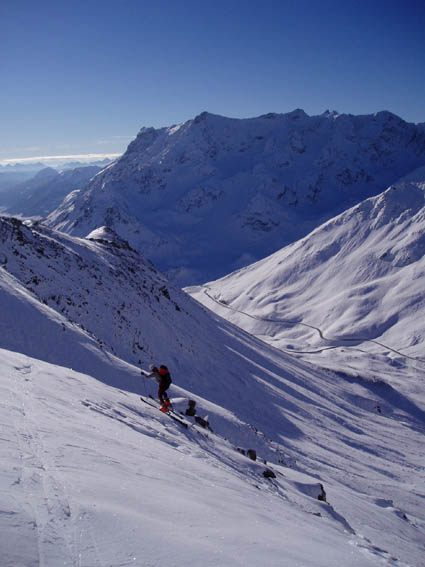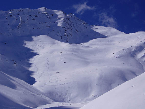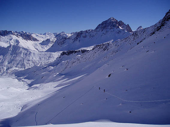 Départ route Galibier versant hautes-alpes à 2400m, montée sud au pic Blanc, descente nord-est, remontée nord-est à l'épaule des 3 évéchés, redescente par la même voie et retour sur la route du Galibier versant Savoie par une remontée de 250 m. Récup. voiture. D+/D- : 1800, ski : 2.3