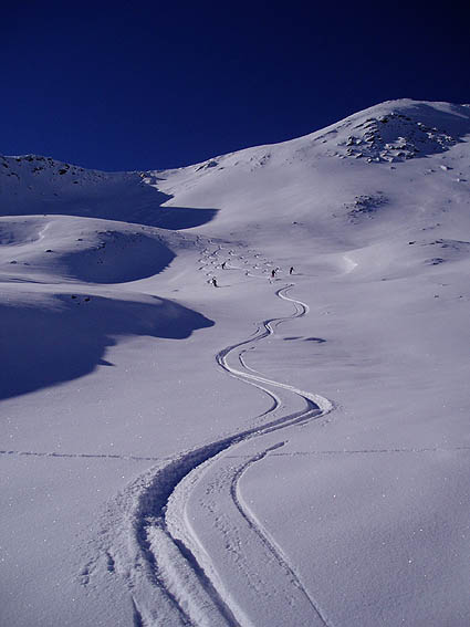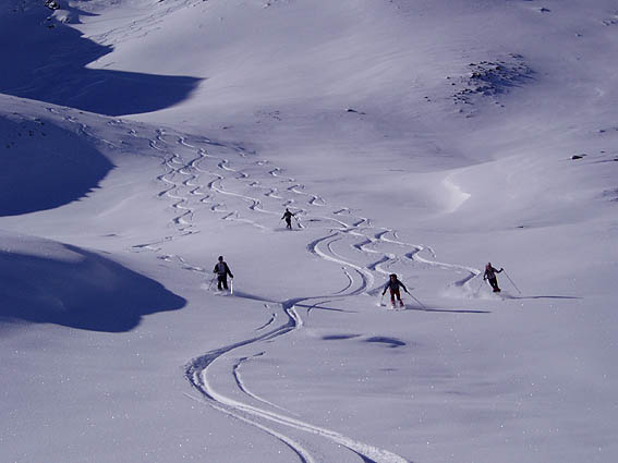 Une sortie de ski d'automne géniale : les deux descentes dans une super poudre avec une sous-couche qui permet d'attaquer sans avoir peur de toucher (à condition de rester dans les combes toutefois). Comme en plein hiver ! La boucle prévue au départ (retour versant SE des 3 Evéchés) a été délaissée au profit d'un circuit moins logique mais totalement poudreux et non tracé avant nous.