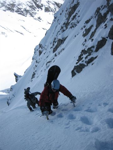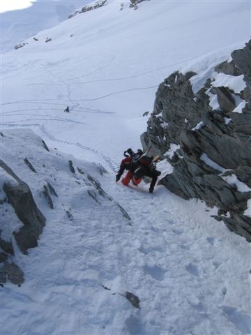 C6 Montée dans l'axe, la barre du bas est enneigée en rive droite. La bande de neige est encore trop étroite pour y descendre, nous sommes passés par la vire à gauche en descendant. Sinon la corniche n'est pas importante.