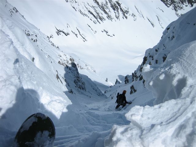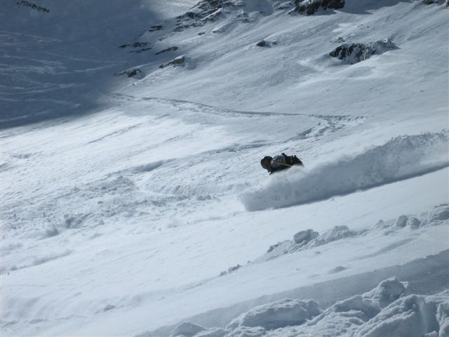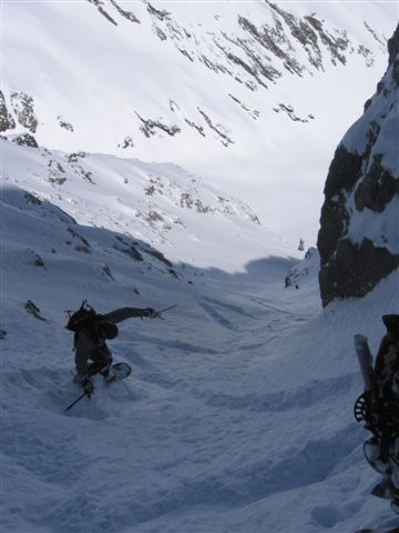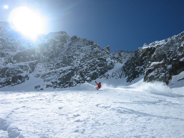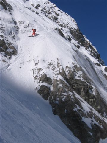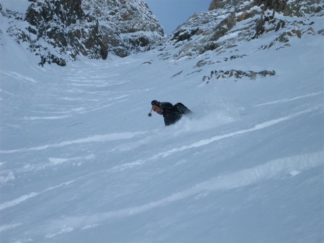 Les dernières chutes de neige ont remit la pente à neuf. La meilleure partie est entre le ressaut du bas et le couloir proprement dit où c'est tout en grosse poudre bien stable. Dans le couloir la couche de poudreuse est moins importante mais permet tout de même un ski serein.Il y a juste les 10 m sous la corniche où la poudre part en petite plaque. Une première couche de 5 cm dépais et une deuxième en dessous d'une quinzaine.
