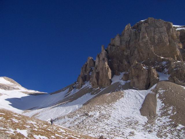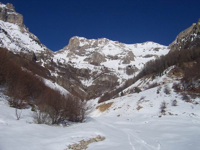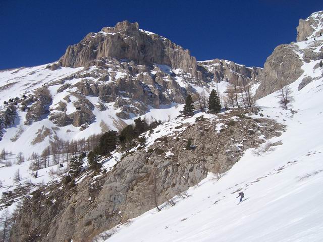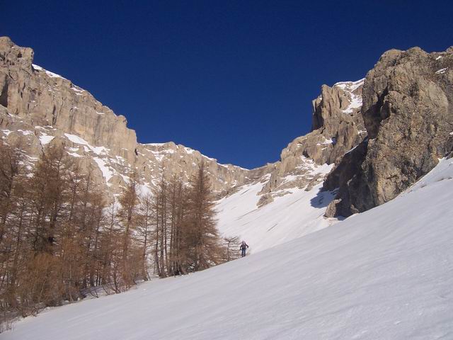 Notre objectif était la Tête des Pras Arnaud, mais on l'a révisé sans hésiter en arrivant au parking; le 1er tiers du pas de Paul ne passe carrément pas à ski. Ce n'était pas vraiment un problème tant les itinéraires sont nombreux dans ce cirque. La combe de Mai permet une montée au soleil, ce qui était très appréciable ce jour. Quand à la combe d'Aurouze, c'est 1000m de pente soutenue sous les rochers de Bure