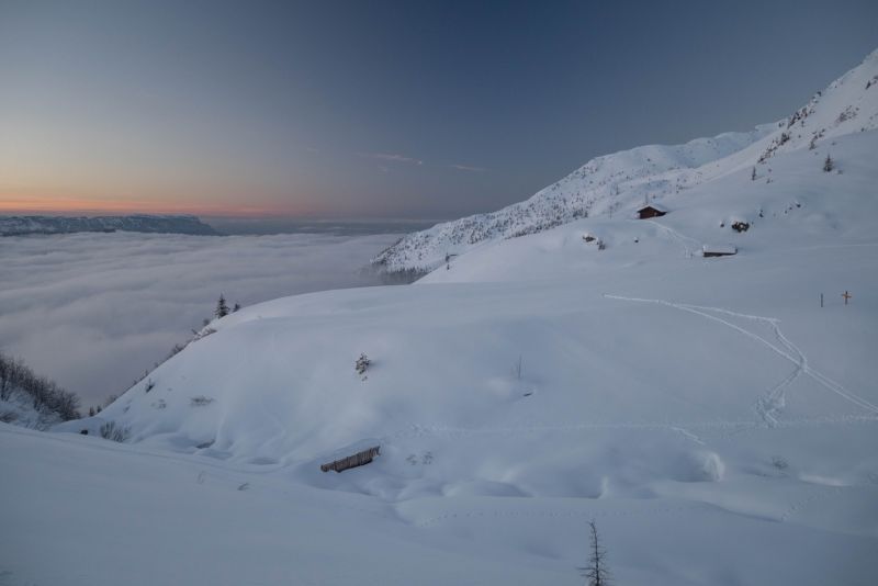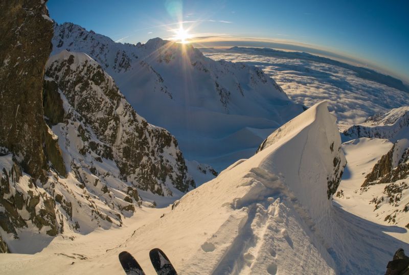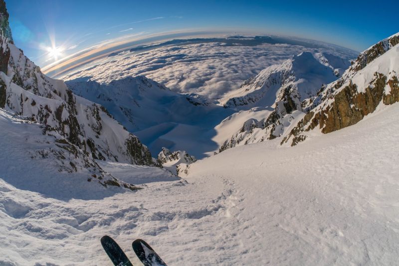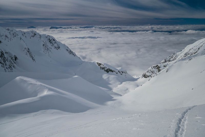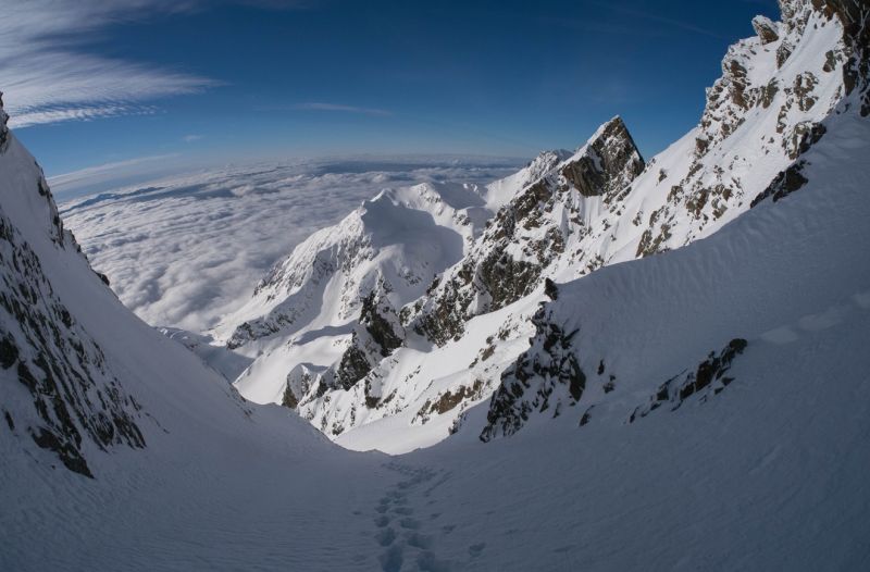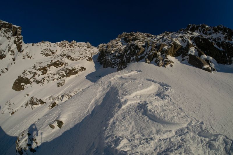 - nivologie : avec les accidents de ces jours (et encore aujourd'hui au Charmant Som par risque 2), difficile d'affirmer quoi que ce soit. Je n'ai toutefois par remarqué de zones d'accumulations et une quantité de neige meuble homogène jusqu'à la base du couloir (environ 50 cm) sur de la neige tassée. Neige poudreuse sans cohésion si ce n'est 3 cm en surface à peine ventés (insensible avec 100 au patin). C'est ce qui m'a incité à aller voir ce couloir qui n'était pas mon objectif (parti juste pour un col). Dans le couloir, ça va du gros gros brassage (jusqu'à la taille !!!) à 10 cm posés sur du grain fin.