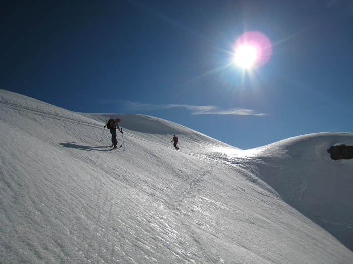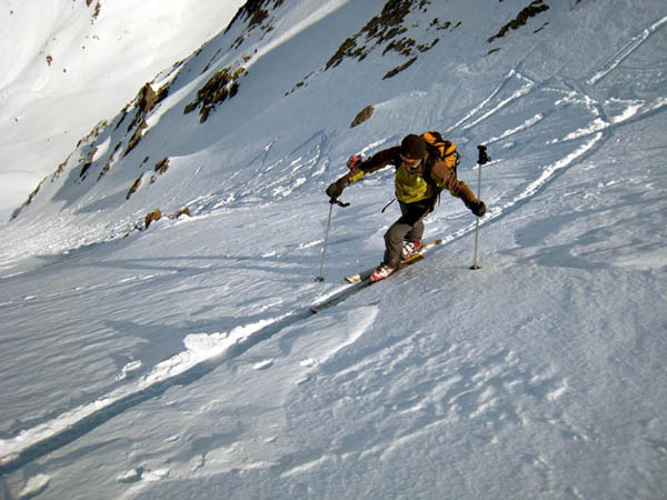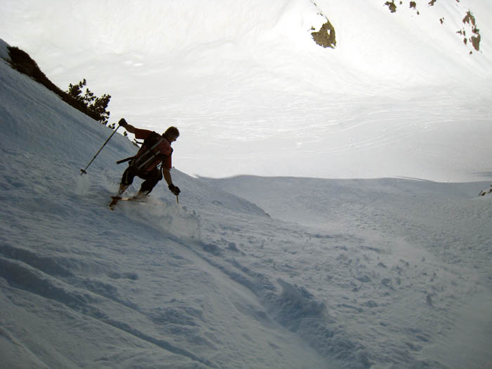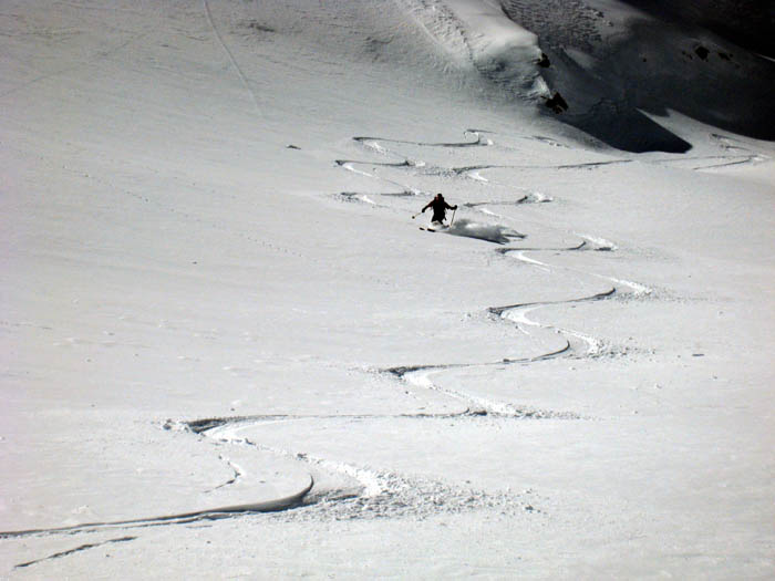 Nous avons pris à la descente du col de Roche Noire, un vallon suspendu qui prend naissance près du col situé entre Roche Noire(2711) et la Pte du Muret, et qui dessert plusieurs petits couloirs qui ramènent dans le vallon de Roche Noire. Neige poudreuse excellente, zéro trace.