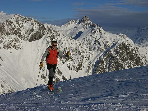 Peut-être skié la première fois par Lionel Taldu, ce couloir n'est pas souvent en conditions ; il est vite goulotté ou présente des étroitures peu (ou pas) skiables. Il faut des conditions de neige transformée d'hiver. 30 m sous le sommet, une étroiture d'1m40 m'a obligé à déchausser sur 3m. Il serait possible de garder les skis au prix d'une acrobatie genre tout droit mais la neige est glacée à cet endroit. A noter que si c'est transfo partout en versant chauds, le couloir est en neige tellement tassée qu'à chaque virage ça racle un fond bien dur (revenu sur 3 cm seulement à 13h). Autre endroit où il fallait se méfier : flanc nord du col de la Passure où le cm tombé la nuit masque une partie vitrifée : deux virages très limites dans du 35° !