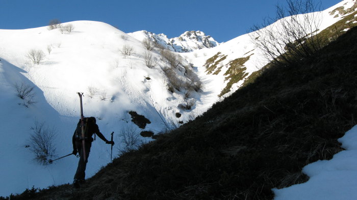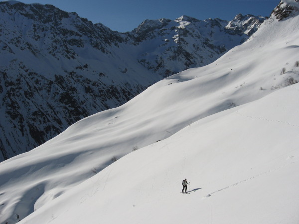 Pas du tout partis pour ça, le manque d'enneigement de l'objectif initial nous a permis de compenser le but par une belle descente en neige parfaite malgré le départ tardif (11h30 du sommet). Coin toujours aussi sauvage malgré les quelques skieurs disséminés dans tous les vallons de Navette.