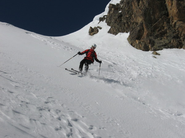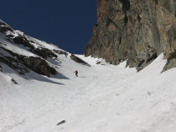 Neige transformée dans le couloir sauf les 200 derniers mètres orientés + NE donc plus froid. De très bons moments de moquette, heureusement entrecoupés de boules par endroits pour freiner un peu la cadence!