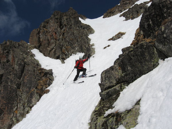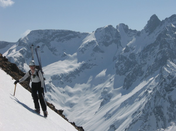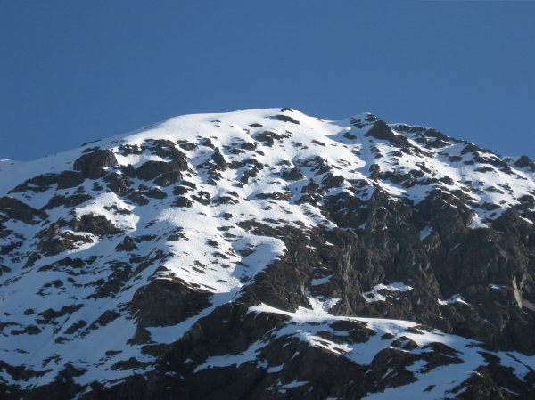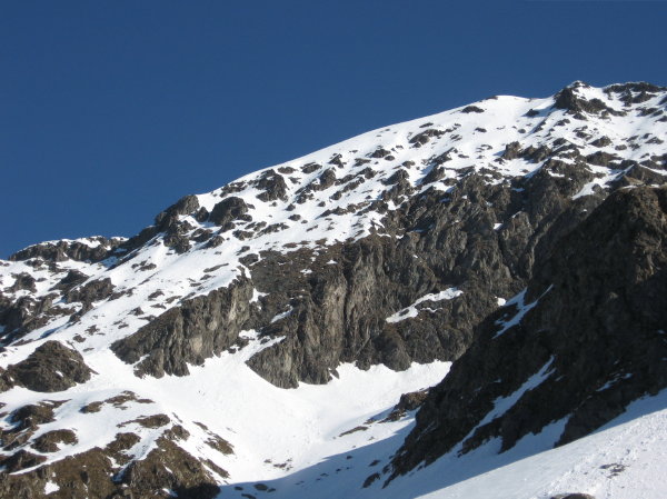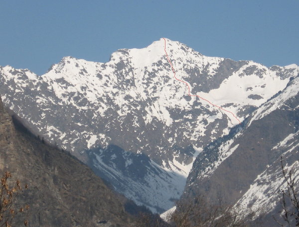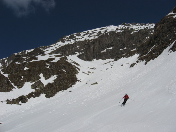 Merci à Lio pour les infos. Cette face est majestueuse et attrape l'oeil quand on rentre dans la vallée de Molines. Conditions de neige extras avec un portage limité en rusant un peu entre la rive gauche du vallon et le lit du ruisseau. Personne dans le secteur si ce ne sont quelques chamois qui nous montraient la route à suivre au pied de la face.