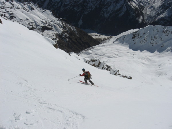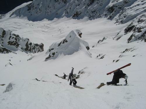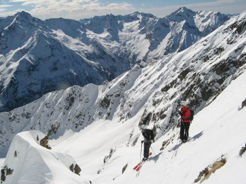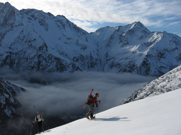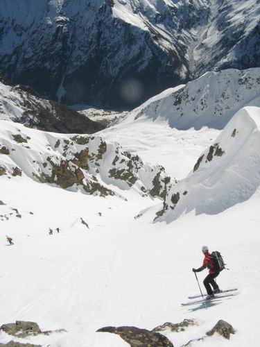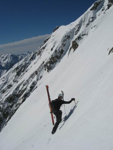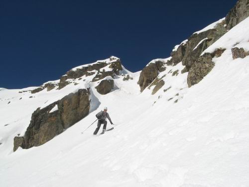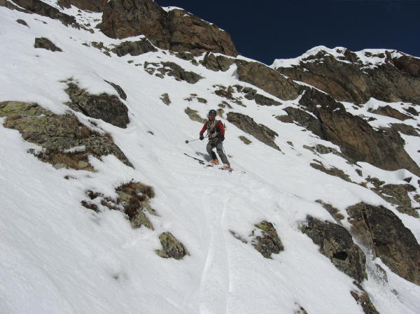 Une superbe sortie dans un vallon bien sauvage. Les voiles nuageux de la matinée poussés par du vent d'E empêchaient la neige de dégeler: à 9h30 les versant E étaient encore béton! Du coup nous sommes montés tranquilement en comptant camper au sommet pour attendre que ca décaille. Finalement le soleil est revenu et en moins d'une heure le retard de dégel était récupéré! Si bien que nous sommes descendus sans trainer au sommet. La surprise du jour: au parking nous voyons débarquer une collective skitour d'une dizaine de personnes, mais finalement nous ne nous sommes pas gênés, en revanches les chamois locaux n'ont jamais du voir autant de skieurs en une journée!