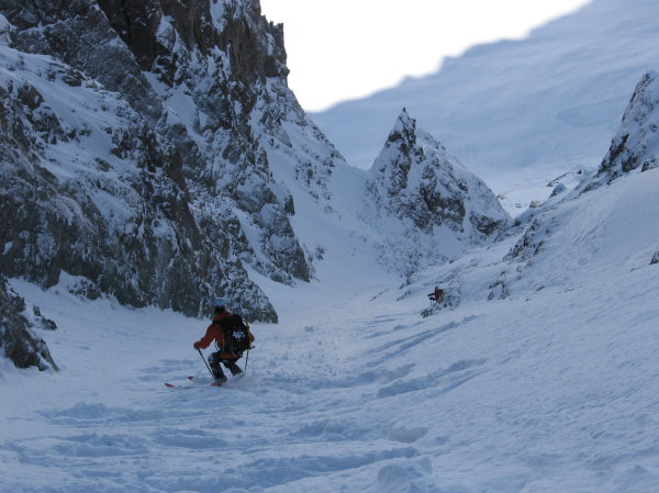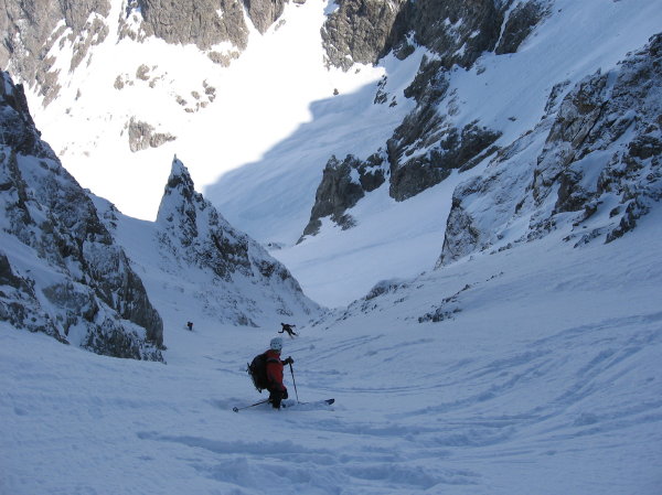 Couloir N en bonnes conditions de neige sauf les 50 derniers m: fond douteux en gobelets sur 20-30cm et étroiture inskiable car pas assez remplie: on s'arrete là le reste est si bon, ca serait dommage de s'en priver!